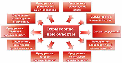 Существуют так называемые взрывоопасные объекты. Это объекты, на которых транспортируют, используют, хранят или производят взрывчатые вещества. К таким объектам относятся предприятия, производящие порох, ракетное твердое топливо или пиротехнические средства, а также продукцию на их основе. Кроме того, к взрывоопасным объектам относятся предприятия нефтяной, химической, газовой, текстильной и хлебопродуктовой промышленности. Наконец, взрывоопасными объектами являются склады вооружений, горючих жидкостей или сжиженных газов.