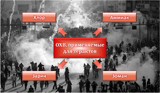 Иногда террористами могут применяться опасные химические вещества, такие, как например, аммиак или хлор.