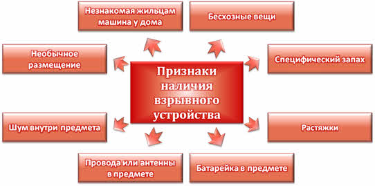 Рассмотрим признаки наличия взрывных устройств. В первую очередь, это бесхозные вещи: чемоданы, сумки, мешки, коробки, свертки и так далее. Также, взрывное устройство может оказаться в машине, припаркованной возле дома (незнакомой жильцам). Признаком наличия взрывного устройства является необычное размещение бытового бесхозного предмета (например, стиральная машина на газоне). Если внутри обнаруженного предмета присутствует какой-то шум, вроде тиканья часов, щелканья или скрипа, то это также может указывать на наличие взрывного устройства внутри. Присутствие проводов, антенны или источников питания (вроде батарейки), тоже является признаком наличия взрывного устройства. Наконец, к признакам наличия взрывного устройства относятся растяжки (например, из проволоки или веревки), а также, специфический запах, который совершенно не сочетается с конкретной местностью.