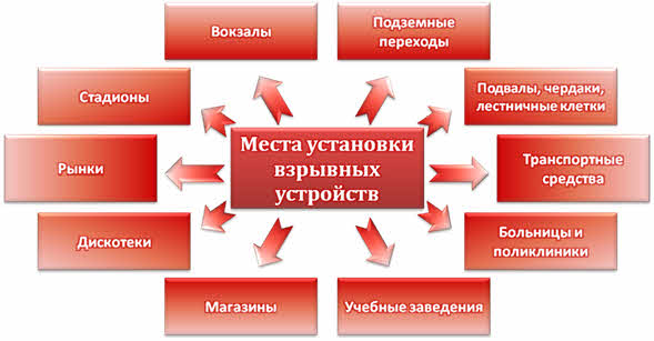 Теперь рассмотрим возможные места установки взрывных устройств. Это, конечно, места скопления большого количества людей. Подземные переходы, вокзалы, стадионы, рынки, дискотеки, магазины, учебные заведения, больницы и поликлиники, транспортные средства, а также подвали, чердаки и лестничные клетки жилых домов.