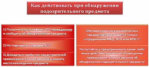 Федеральная служба безопасности дает следующие рекомендации, как действовать при обнаружении подозрительных предметов. Первым шагом необходимо сразу же сообщить в полицию об обнаруженном предмете. Ни в коем случае не подходить к предмету, а просто дождаться прибытия представителей правоохранительных органов и указать место нахождения подозрительного предмета. Помните, что обезвреживание взрывоопасного предмета производится только сотрудниками МВД, ФСБ или МЧС. Ни в коем случае не пытайтесь обезвредить предмет самостоятельно. Не подходите к нему, не пытайтесь подвинуть или поднять его с помощью подручных средств. От вас требуется только оповещение правоохранительных органов. Любая иная самодеятельность может только навредить вам и окружающим.