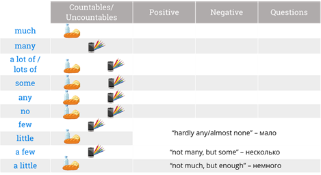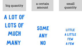 But in English we have several words for each idea. For example, for a large quantity sometimes you have to use a lot of / lots of, much or many; for a small quantity it’s sometimes little / a little, sometimes few / a few. We also have some, any and no.