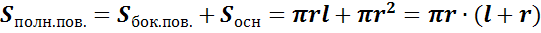 Площадью полной поверхности конуса называется сумма площадей боковой