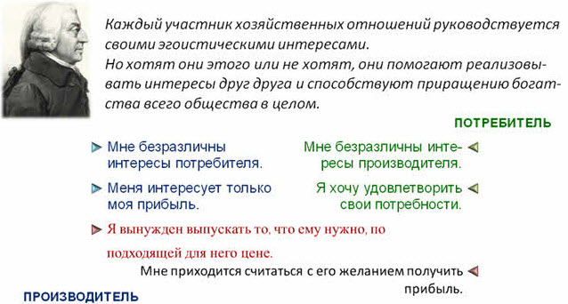 Объективность рыночных законов ярче всего выразил шотландский экономист Адам Смит ещё в конце восемнадцатого века. Он заявил, что рынком управляет «невидимая рука». Что именно имелось ввиду? Каждый участник хозяйственных отношений, писал Смит, руководствуется своими эгоистическими интересами. Например, производитель думает не о том, как облагодетельствовать человечество своими товарами. Ему, в общем-то, нет дела до нужд человечества. Он хочет получить прибыль от продажи произведённой продукции, и чем больше, тем лучше. Но вся фишка в том, что в условиях рынка свободен не только производитель, но и покупатель.