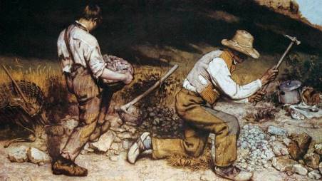 На картине «Дробильщики камней» Курбе изобразил людей, которых встретил по дороге в родной город Орнан. Он назвал их «законченным олицетворением нищеты».