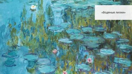 Одной из самых дорогих картин в мире являются «Водяные лилии». Обратите внимание на цвета. Дело в том, что к моменту написания картины Моне перенёс операцию на глазах, и у него было нарушено восприятие цвета. Отсюда преобладание голубоватых тонов на его поздних работах.